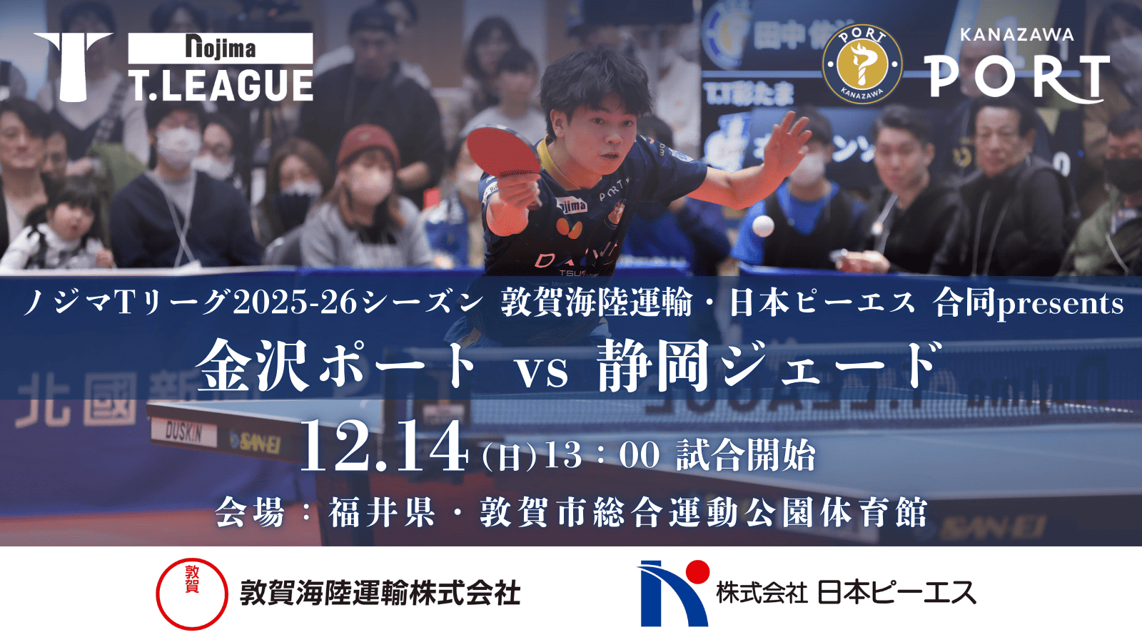 このたび、2025年12月14日(日)に実施をする「ノジマTリーグ2025-2026 金沢ポート vs 静岡ジェード」の一戦を敦賀海陸運輸株式会社(本社:福井県敦賀市 / 代表取締役社長 有馬 茂人)と株式会社日本ピーエス(本社:福井県敦賀市 / 代表取締役社長 有馬 浩史)の合同冠協賛により、「敦賀海陸運輸・日本ピーエス 合同presentsマッチ」として開催することが決定しましたのでお知らせします。