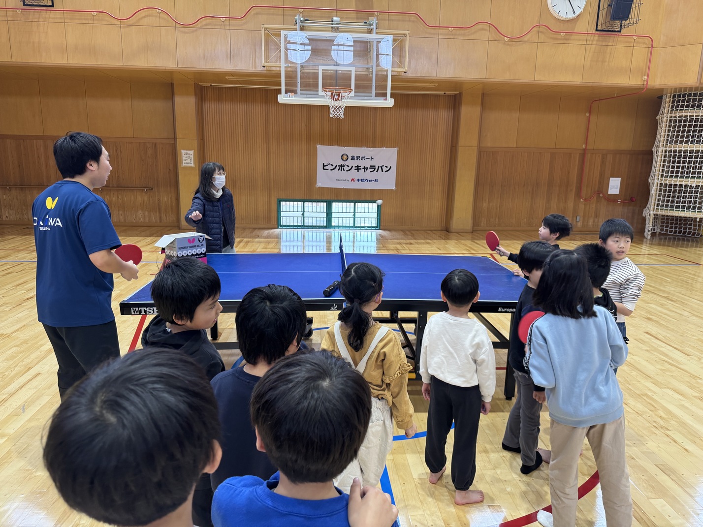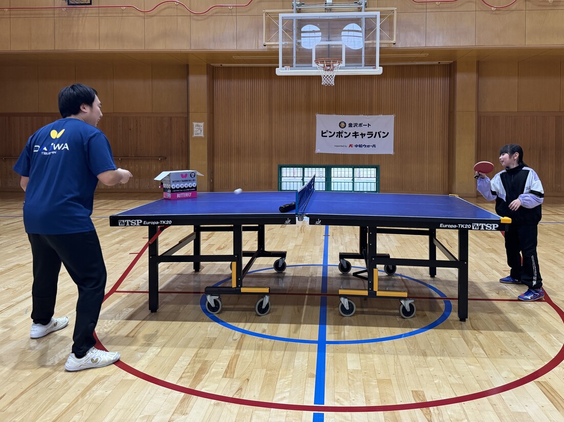 「金沢ポート ピンポンキャラバン」は、プロ卓球チーム・金沢ポートの選手やスタッフが地域の児童クラブや小中学校を訪問し、楽しく卓球を体験してもらうプロジェクトです。