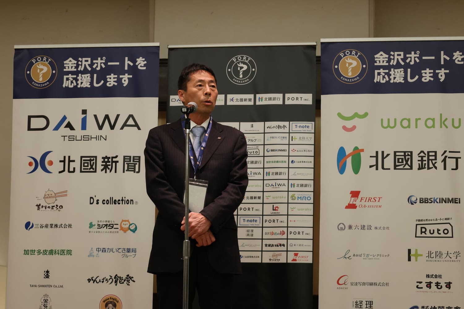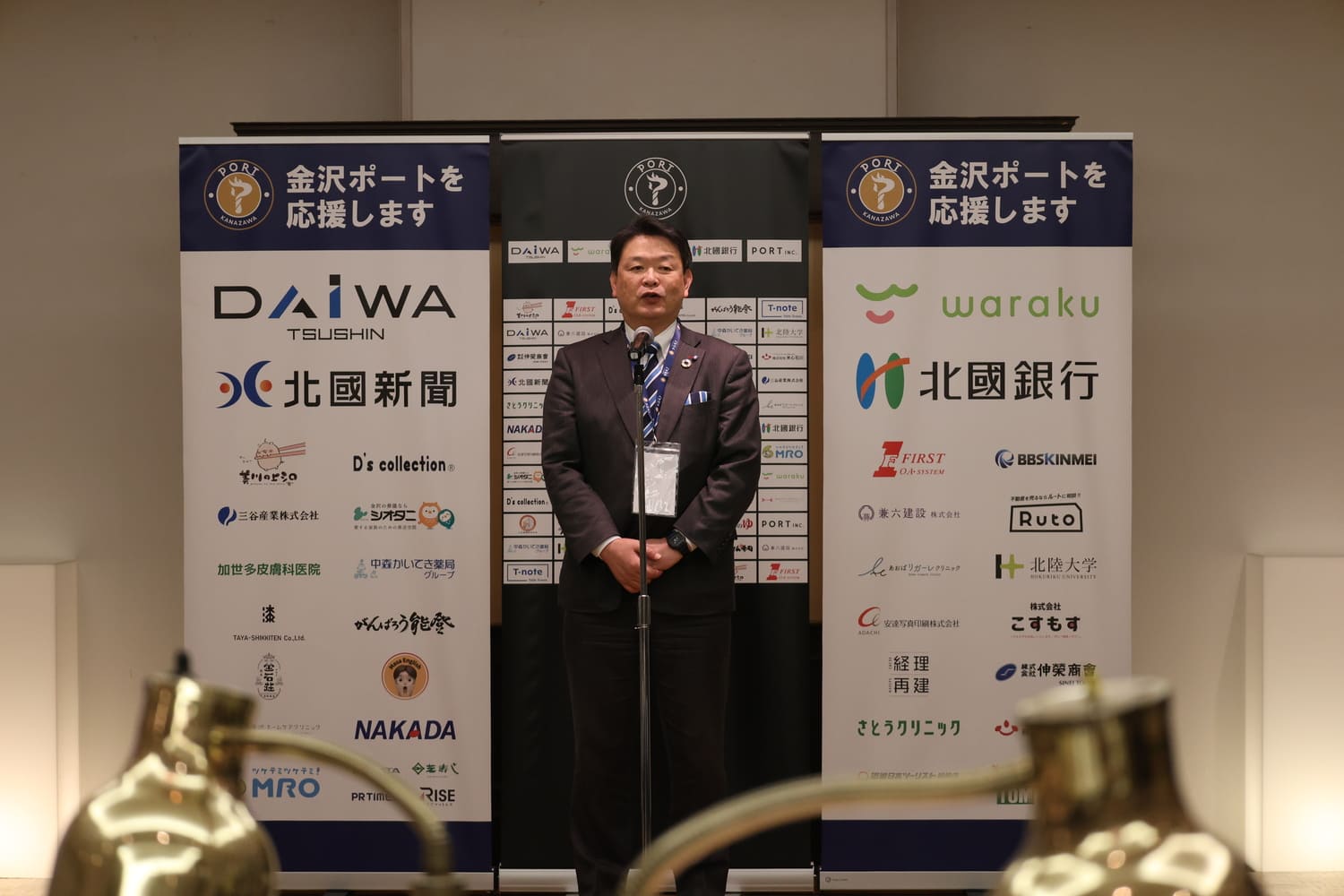 西東輝代表兼監督のあいさつから始まり、石川県参事 北川博勝様、七尾市長 茶谷義隆様に来場者代表のご挨拶、金沢市副市長 新保博之様に乾杯のご発声を賜りました。