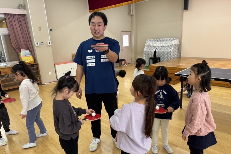 かわニャンは応援団長として、試合当日の応援の先導はもちろん、県内の児童館や幼稚園などを積極的に訪問し、「卓球をもっと身近に」という想いで普及活動にも尽力してきました。