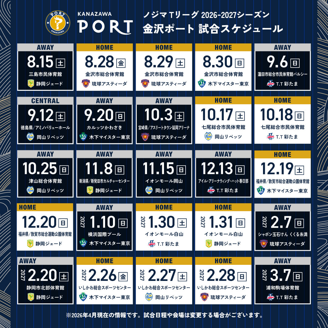 このたび、2026-2027シーズンの金沢ポートのマッチスケジュールが決定しましたので、お知らせします。