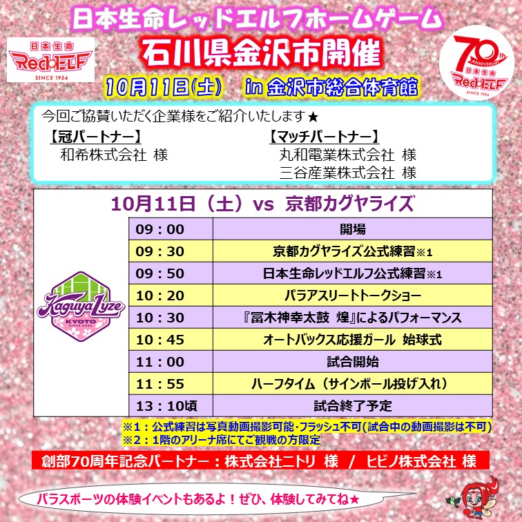 日本生命レッドエルフホームゲーム金沢会場『WAKI(石川県オートバックスグループ)presents 日本生命レッドエルフホームゲーム in 金沢 能登半島復興支援試合』のイベントとスケジュールが決まりましたのでご連絡いたします。