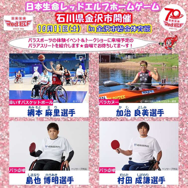 日本生命レッドエルフホームゲーム金沢会場『WAKI(石川県オートバックスグループ)presents 日本生命レッドエルフホームゲーム in 金沢 能登半島復興支援試合』で開催されるパラスポーツ体験イベント&トークショーに来場予定のパラアスリートを紹介します!