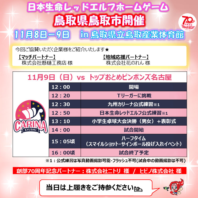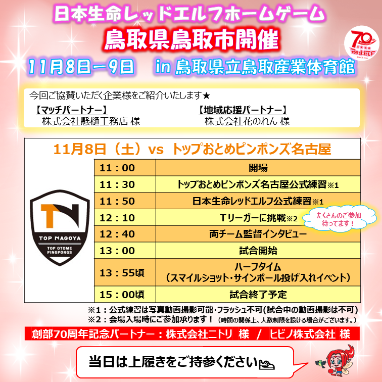日本生命レッドエルフオープニングホームゲーム鳥取会場の イベントとスケジュールが決まりましたのでご連絡いたします。 【試合情報】 11月8日(土)VS トップおとめピンポンズ名古屋 13:00試合開始(11:00開場) 11月9日(日)VS 九州カリーナ 14:00試合開始(12:00開場) 会場:鳥取県立鳥取産業体育館(鳥取県鳥取市)