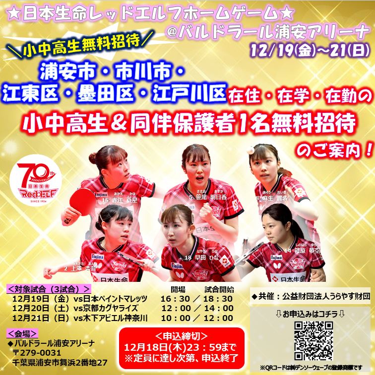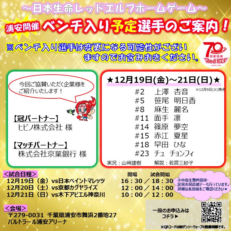 12月19日(金)~21日(日)にバルドラール浦安アリーナにて、次の企業様にご協賛いただき日本生命レッドエルフホームゲームを開催します! 【冠パートナー】 ヒビノ株式会社 様 【マッチパートナー】 株式会社京葉銀行 様 今回のベンチ入り予定選手を紹介いたします✨ ※ベンチ入り選手は変更になる可能性がございますのでお含みおきください。 日本生命レッドエルフの公式SNS(X,Instagram)には、赤江選手からのメッセージ動画も掲載しています! ぜひ、ご確認ください★
