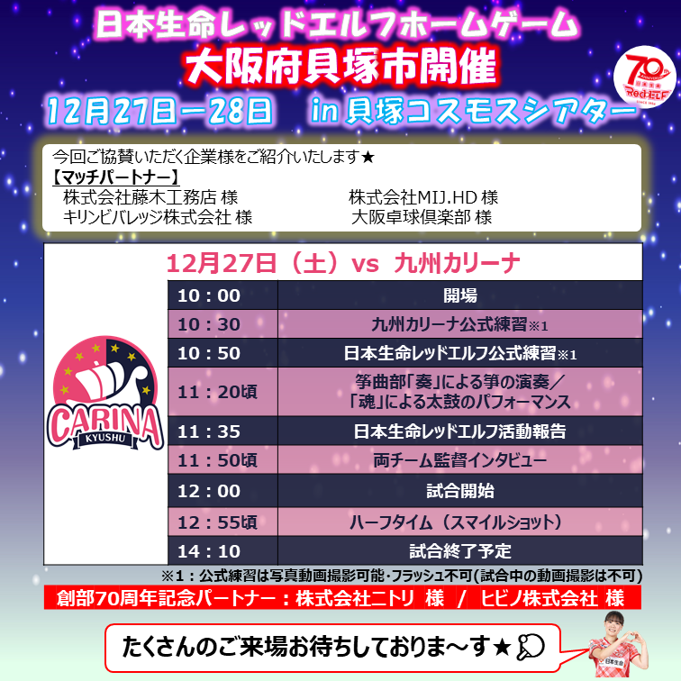 日本生命レッドエルフオープニングホームゲーム浦安会場の イベントとスケジュールが決まりましたのでご連絡いたします。 【試合情報】 12月27日(土)VS 九州カリーナ 12:00試合開始(10:00開場) 12月28日(日)VS トップおとめピンポンズ名古屋 12:00試合開始(10:00開場) 会場:貝塚コスモスシアター(大阪府貝塚市)