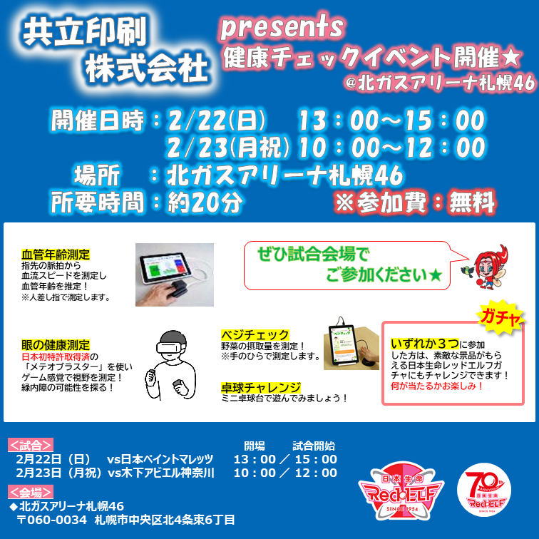 2月22日(日)、23日(月祝)に北ガスアリーナ札幌46にて、次の企業様にご協力いただき日本生命レッドエルフホームゲームを開催します!