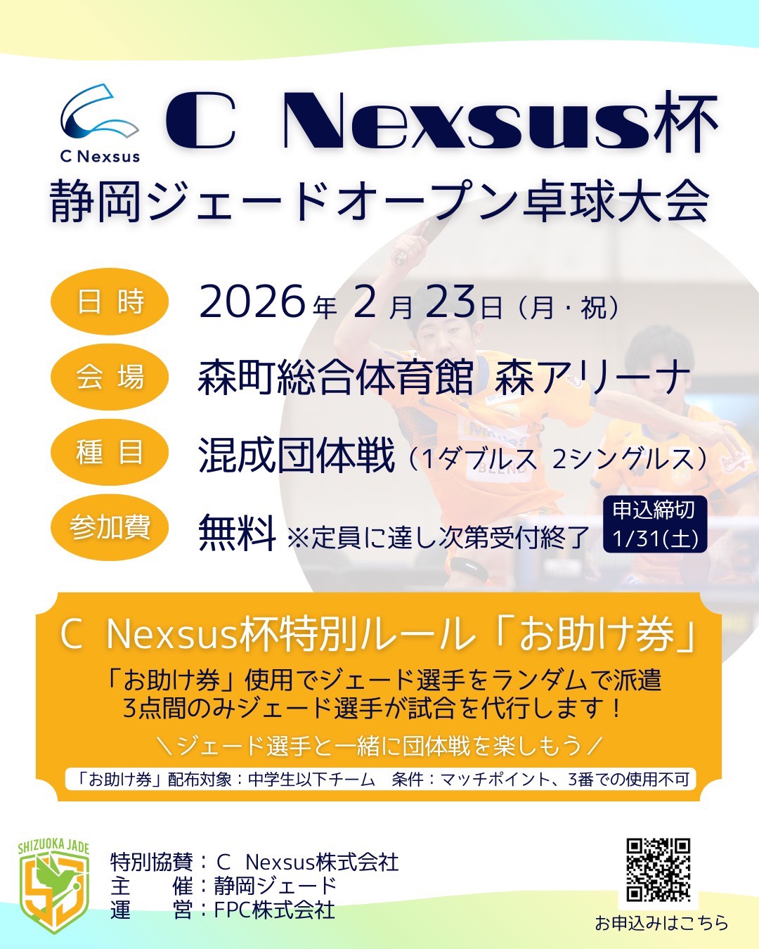 この度、C Nexsus株式会社様特別協賛のもと、『C Nexsus杯 静岡ジェードオープン卓球大会』を開催いたします。