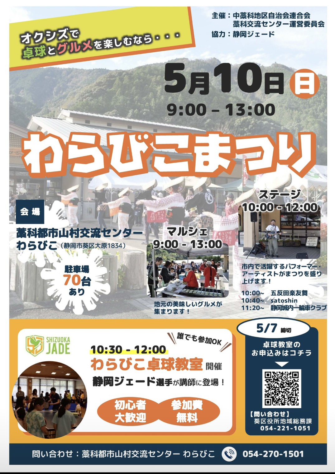 5月10日(日)開催の「わらびこまつり」に静岡ジェードの選手が講師となり卓球教室を開催します!