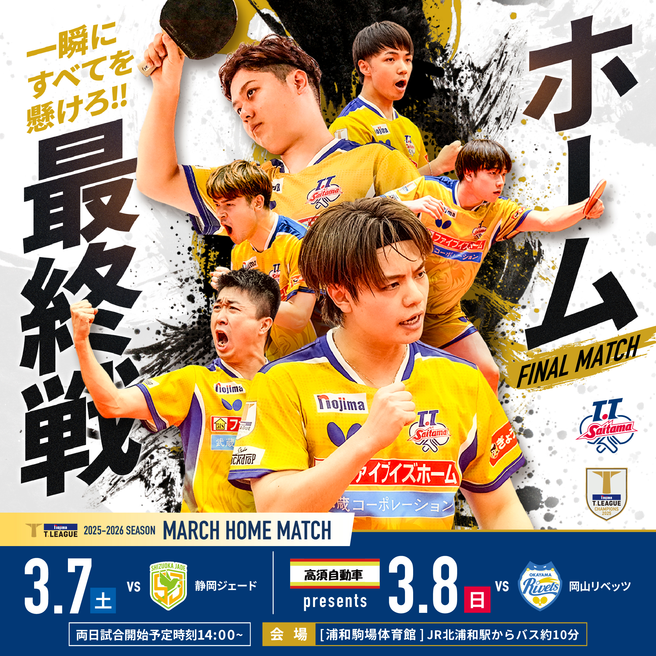 2025-2026シーズンもいよいよ最終戦。男子Tリーグは、熾烈なプレーオフ進出争いとなっている。そして迎えるホーム最終戦では、監督兼選手としてプレーする町飛鳥選手や今季男子Tリーガー唯一のペンホルダー・松下大星選手擁する静岡ジェード。日本のエース・張本智和選手や彩たま在籍経験のある英田理志選手擁する岡山リベッツ。両チームどのようなメンバー構成でも厳しい戦いが予想される。