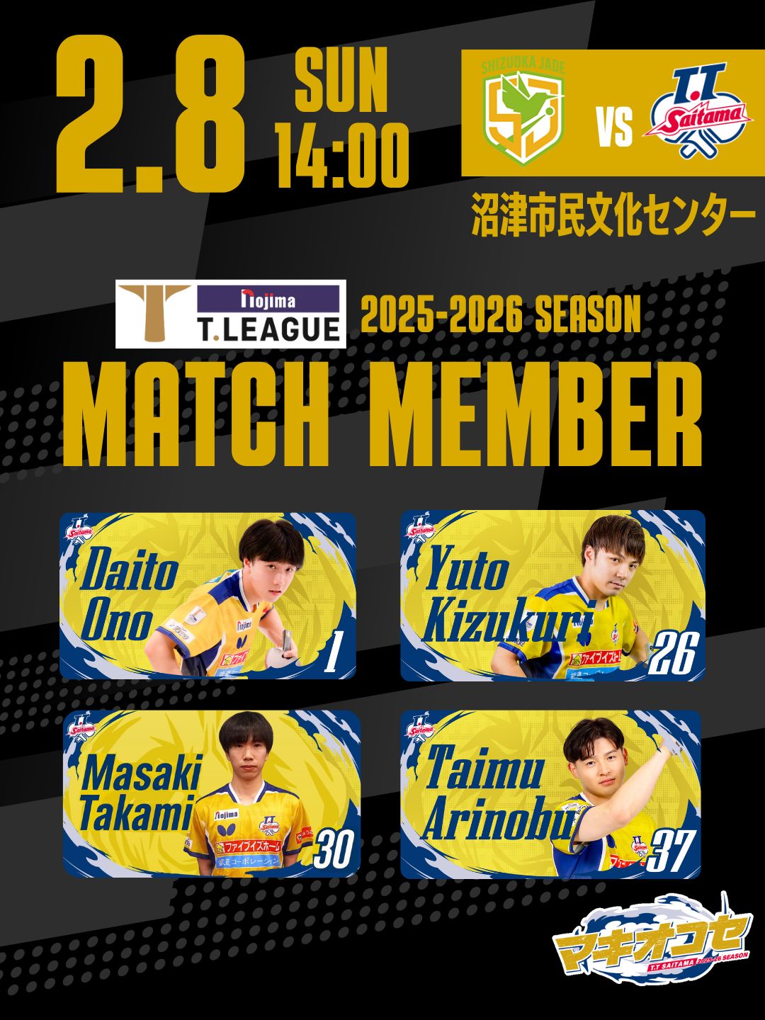 2/8(日)沼津市民文化センターで開催の静岡ジェード戦のT.T彩たまベンチメンバーに関するお知らせです。