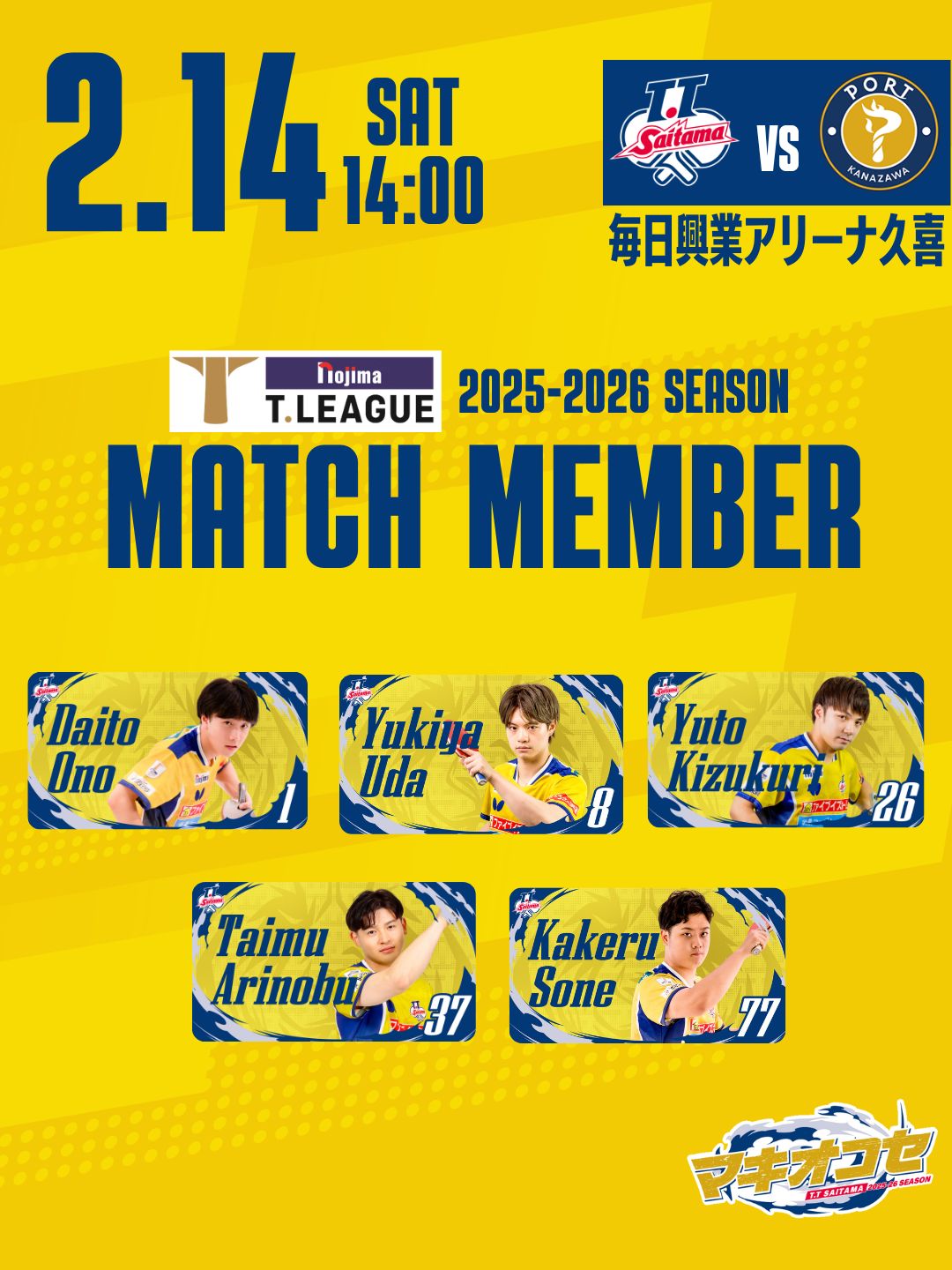 #1 小野泰和 #8 宇田 幸矢 #26 木造 勇人 #37 有延 大夢 #77 曽根 翔 ※状況により、ベンチ登録選手がメンバーから外れる場合もございます。予めご了承ください。