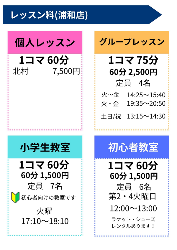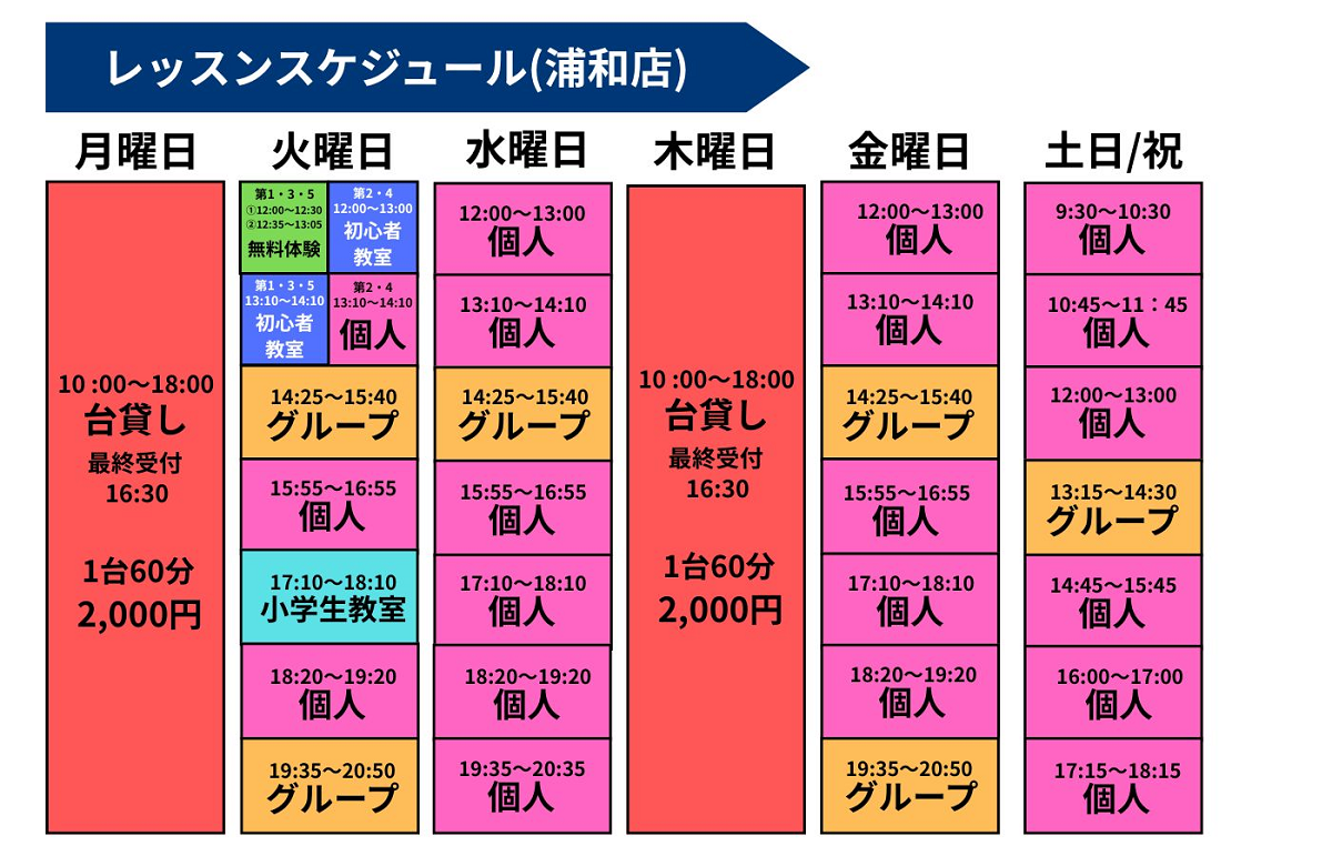 無料体験レッスン無料体験レッスンはそれぞれ1回のみ受講可能です。(グループレッスン(浦和美園店のみ)、小(中)学生教室、個人レッスン1回受講が可能です。)